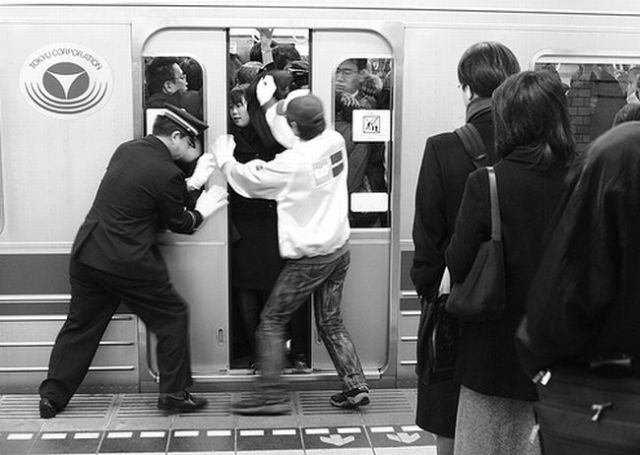 Japonya da normal bir günve insanlar işlerine yada gitmek istedikleri yerlere ulaşmak için metroyu kullanıyorlar zira bildiğiniz gibi metro zamandan müthiş kar sağlıyor size. Ama işte bu zaman uğruna çekilen çileyi gördüğünüzde insan yuh dmekten kendini alamıyor Hani bizim ülkemizde: "kaptan üst katın anahtarlarını verde yukarı çıkalım" gibi tabirlerin kullanıldığı bir ülkede acaba böyle bir sıkışıklık görsek ne yaparız. Bu yönden Hindistanı takdir ettim adamlar metro yapsalar biliyorlar başlarına gelecekleri o yüzden normal tren seferi yapıyorlar ki uyanık birinin mütemadiyen Türk zekası işleyen daha kaptaaan demeden "La sus üst kat açık çık üst kata" diyip trenin tepesini ve hatta yanlarını da kamu hizmetine sunmuş olmaları. Neyse resimleri bakın ama özellile videoları kaçırmayın gerçekliği gözler önüne seren videolar oha dedirtiyor insana